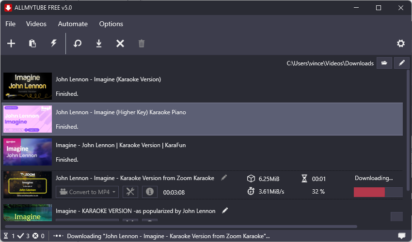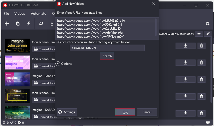 Ad esempio, inserisci “Karaoke + nome canzone” e premi in basso su OK. Il programma cercherà tutti i video karaoke correlati. Nello screenshot qui sotto puoi vedere il nostro test, abbiamo cercato la canzone karaoke “Imagine” di John Lenon.