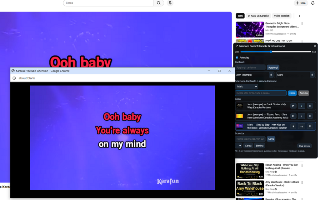 I brani aggiunti vengono messi in coda. L’estensione gestisce automaticamente la rotazione tra i diversi cantanti: basta un click per passare al prossimo, tornare indietro o riprodurre un brano specifico. Addio discussioni su “chi canta dopo”!